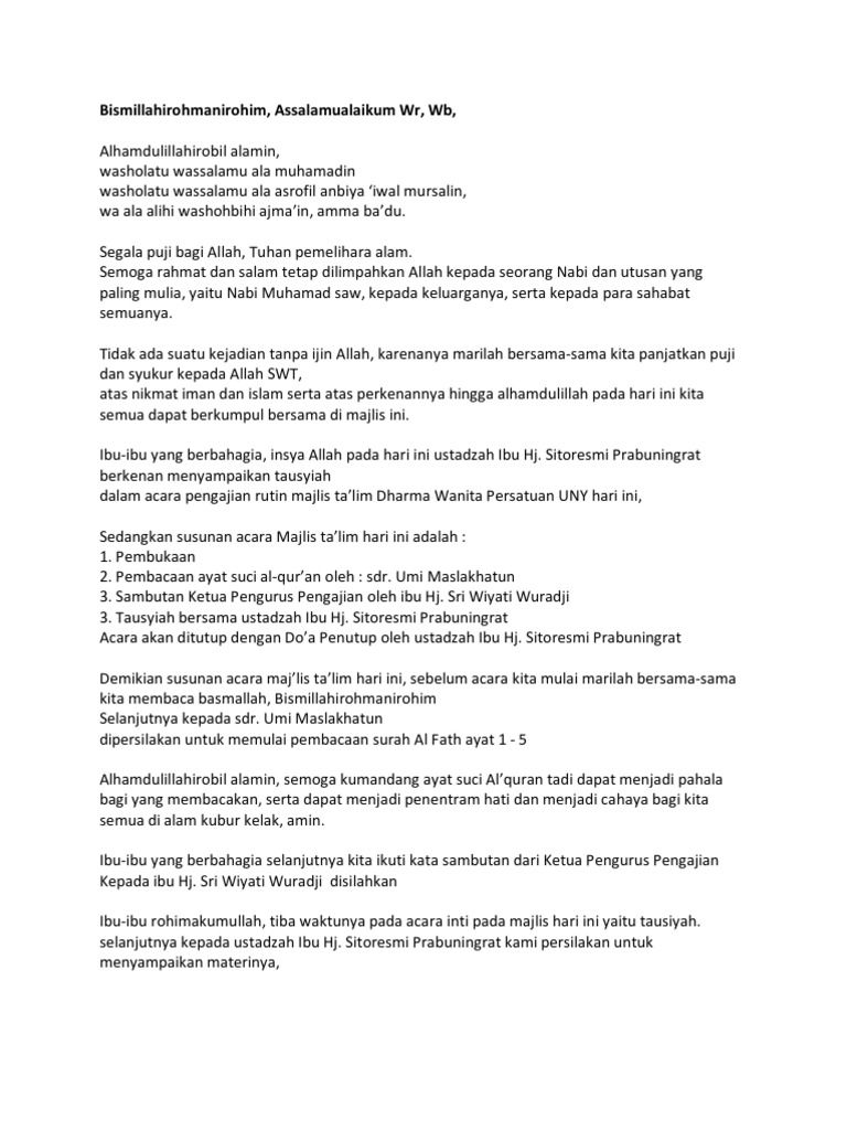 Kalimat pembuka pengajian. Teks kata sambutan dimulai dari pembukaan sampai isinya dengan cara penyampaian yang sederhana. Oleh sebab itu penceramah haruslah orang dengan ilmu pengetahuan. Teks Bacaan Doa Pembuka Acara Majelis dan Terjemahannya - Pada sebuah majelis atau pengajian umat islam baik majelis dzikirwirid ataupun majelis taklimilmu tentunya terdapat urutan dan susunan jalannya acara mulai dari awal hingga akhir.
